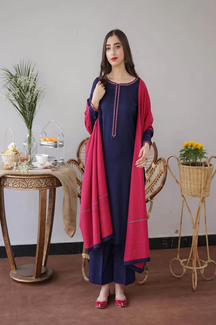 Embroidered dhanak front with neck emb patch and sleeves emb patch & trouser patch, embroidered sleeves, plain dyed dhanak back