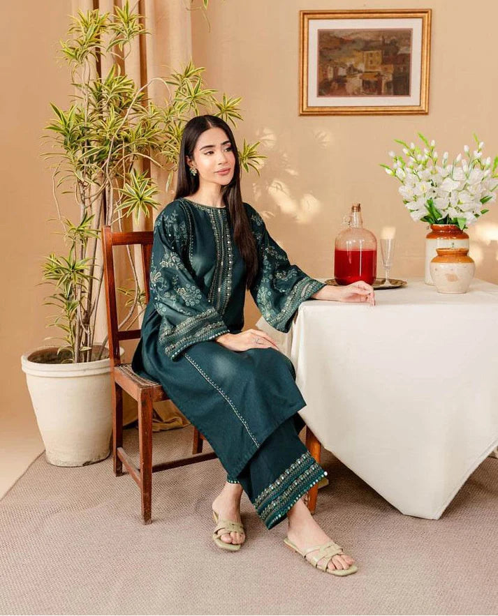 Embroidered Dhanak front with matching neck emb patch, embroidered dhanak sleeves and a plain dyed dhanak back